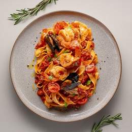 350г Паста, соус Наполі, креветки, мідії, бульйон курячий, томат коктейльний, олія соняшникова рафінована, часник запечений, сир Пармезан, олія оливкова, петрушка, суміш перців.100г:135 Ккал/Ж7,3/В9,2/Б7,3
