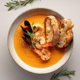 340/40г Основа (томати Пелатті, бульйон курячий, вершки, цибуля,морква,перець солодкий,селера,паста томатна,масло вершкове, часник,орегано,перець чорний),креветка,мідії,чіабата,часник печений, олія оливкова, сіль,мікрогрін горошку.100г:197 Ккал/Ж12/В11/Б8