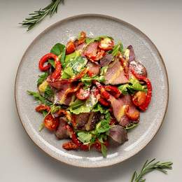 180г Ростбіф (яловичина,масло вершкове,гірчиця,соус вустерширський), мікс салату (рукола, мангольд, шпинат, лоло біонда, лоло россо), соус Медово-гірчичний, перець маринований, томат коктейльний, томат в'ялений,Пармезан, суміш перцю.100г:143 Ккал/Ж9/В6/Б7