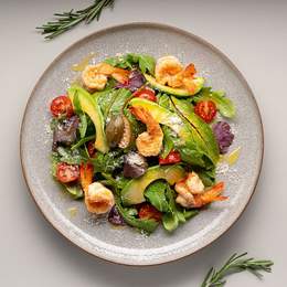 190г Мікс листя салату (рукола, мангольд, шпинат, лоло біонда, лоло россо), томат коктейльний, креветки смажені, соус Римський, авокадо, сир Пармезан, каперси, олія оливкова.100г:169 Ккал/Ж15/В2/Б5