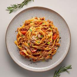 330г Паста, соус Болоньєзе, томат коктейльний, олія соняшникова рафінована, часник запечений, сир Пармезан, олія оливкова, петрушка, суміш перців.100г:173 Ккал/Ж9/В14/Б6