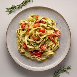 280г Паста, соус Песто, вершки, бульйон курячий, томат коктейльний, томат в'ялений, часник печений, сир Пармезан, олія оливкова, сіль кухонна, петрушка, перець суміш.100г:351 Ккал/Ж23/В27/Б6,7