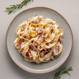 320г Паста, соус Карбонара, шкварки бекону, бульйон курячий, олія соняшникова рафінована, часник запечений, сир Пармезан, олія оливкова, суміш перців. 100г:204 Ккал/Ж16/В7/Б7