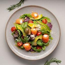 230г Мікс салату. помідор черрі. лосось слабосолений. авокадо. каперси. сир пармезан. соус міцукану.422,96 Ккал (Білки: 15,24; Жири: 37,65; Вуглеводи: 6,89)