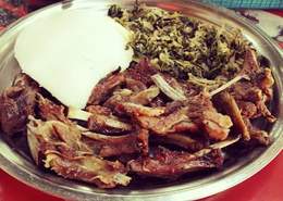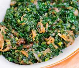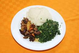 1/2 Dry fry goat served with sukumawiki, Posho and sukumawiki