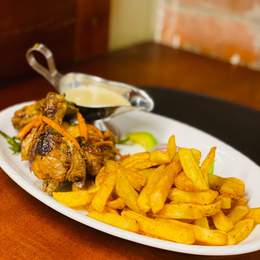 Marinated Grilled Chiocken Wings Hand Tossed In Bbq Sauce With Carrots, Cucumber And Dipping Sauce. (Create Options Of Sides Dishes:Rice, Regular Chips, Mashed Potatoes, Pilau Or House Rice)