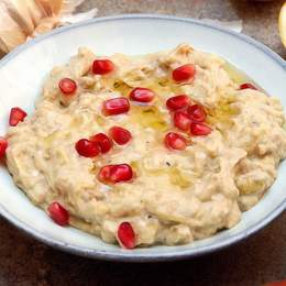 Finely chopped roasted egg plant blended with tahini, lemon juice, and olive oil. Served with pita bread