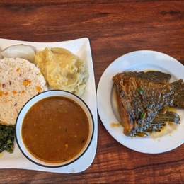 A piece of fish served with Rice, matooke,posho, Sweet potato