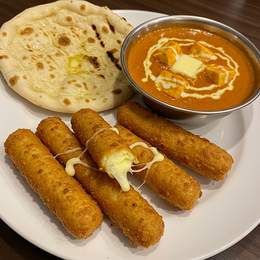 Chicken Malai Tikka served with Chicken Tikka Masala and 1 Butter Naan and for dessert Gulab Jamun