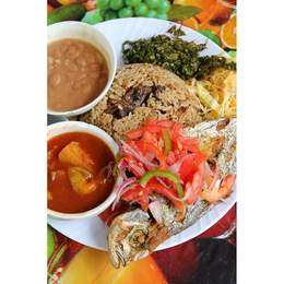 A vegetarian-friendly combo meal served with beans and local staples