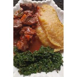 A filling meal combo served with beef and traditional Ugandan accompaniments