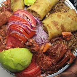 Large platter comes with Half chicken, pilau, chapati’s, Greens , Extra-toppings, and 2 Drinks