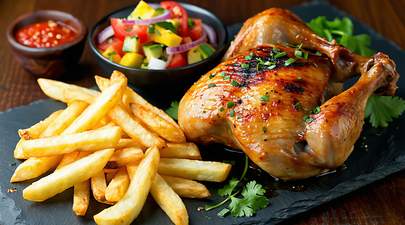 Half grilled chicken mixed with Chips and Cabbages plus tomato sauce