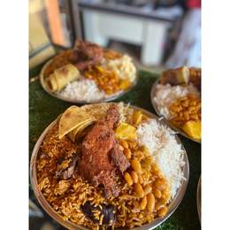 Generous platter of chicken, sides, and accompaniments for group dining. served in different portions of choice