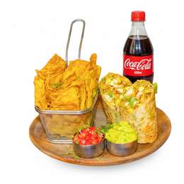 Savory Chicken Buritto served with crunchy Nachos and a coca cola