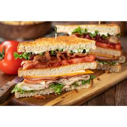 Club sandwich... grilled seasoned chicken and cheese stacked between slices of toasted bread.