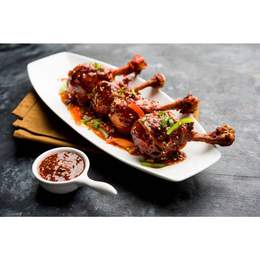 A fusion dish where chicken drumettes are shaped like a lollipop, often marinated and fried for a crispy bite.