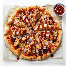 BBQ sauce, chicken, pepperoni, and caramelized onions on a flavorful crust