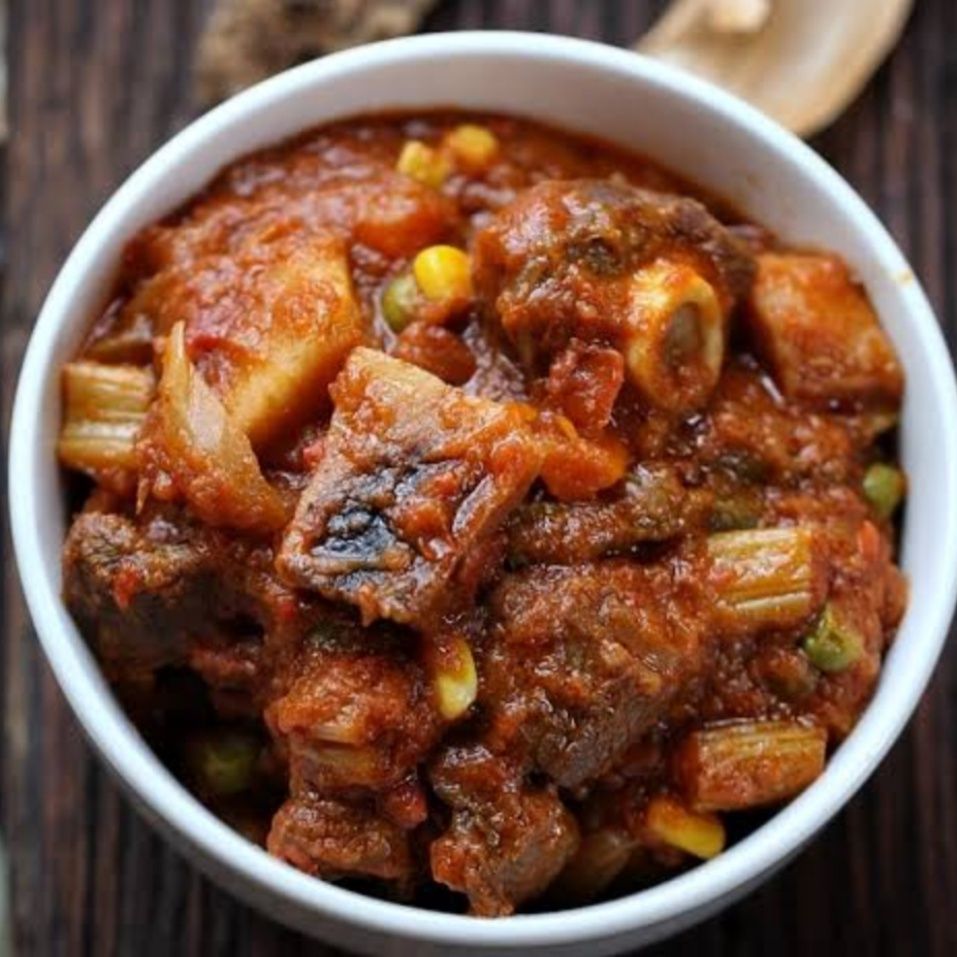 Beef cooked in groundnuts sauce served with your choice of food