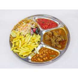 Beautiful fragrant rice made with many aromatic spices, served with chicken, bean stew, chili side & a mouthwatering salad
