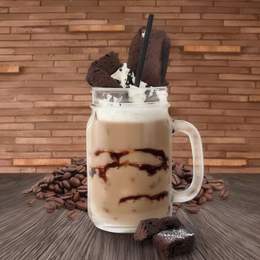 A decadent blended drink combining rich chocolate brownie flavors with ice and milk, topped with whipped cream and brownie bits for a sweet indulgence.