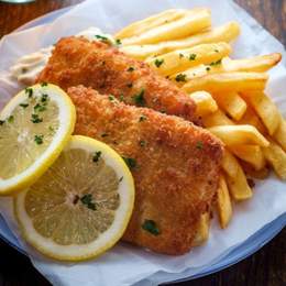 Tempora fried fish of the day served with chips and roasted peppers cream.