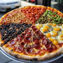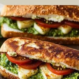 This golden brown grilled cheese makes the sandwich, topped with Veggies, sauce and pesto.