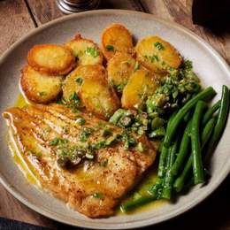 Marinated fish served on a bed of spiced yogurt , baby potatoes and greens with almond and lemon sauce