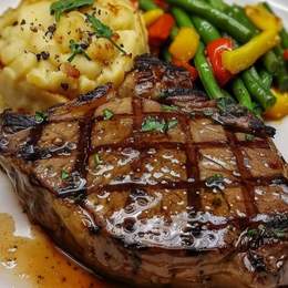 Well marbled and flavoured steak best served with super creamy buttered mashed potatoes and pepper Demi glace-sauce.