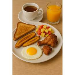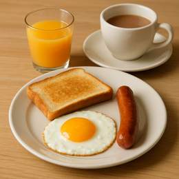 2 eggs of your choice, 2 sausages, bread, home fries, baked beans, fruits, cup of tea/coffee