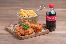 Beef burger served with chips, 2 pieces of chicken and a soda
