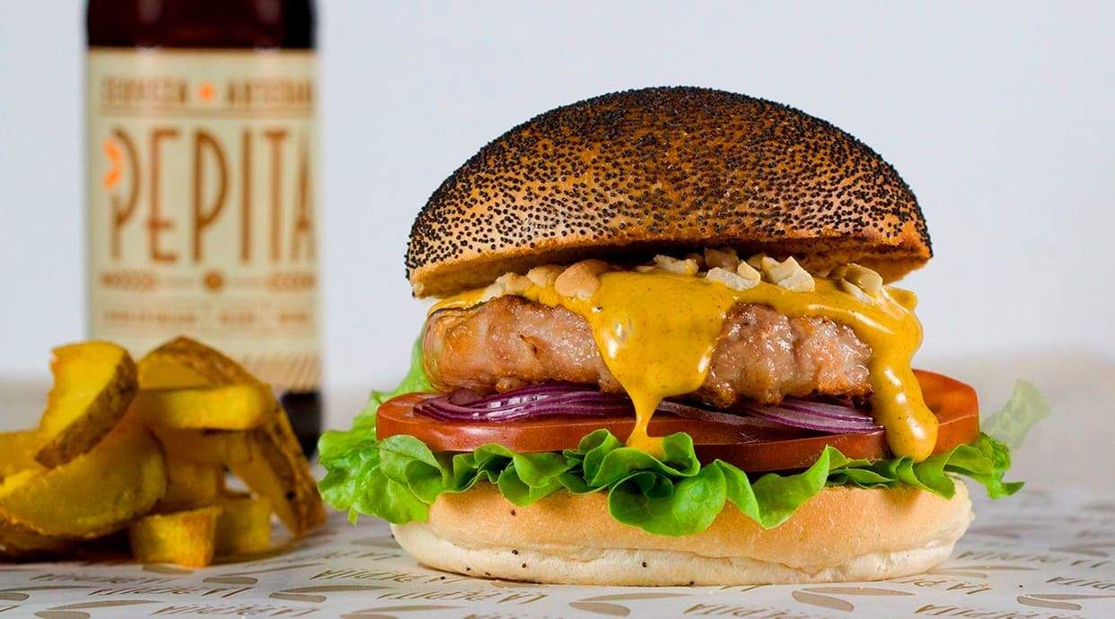 Burger de pollo de corral, salsa especial, anacardos, salsa de curry y mango, lechuga, tomate y cebolla roja.Alérgenos:Burger: Contiene lácteos, frutos secos, apio, mostaza y sulfitos.Salsa especial: Contiene huevo, soja, apio, mostaza y sulfitos.