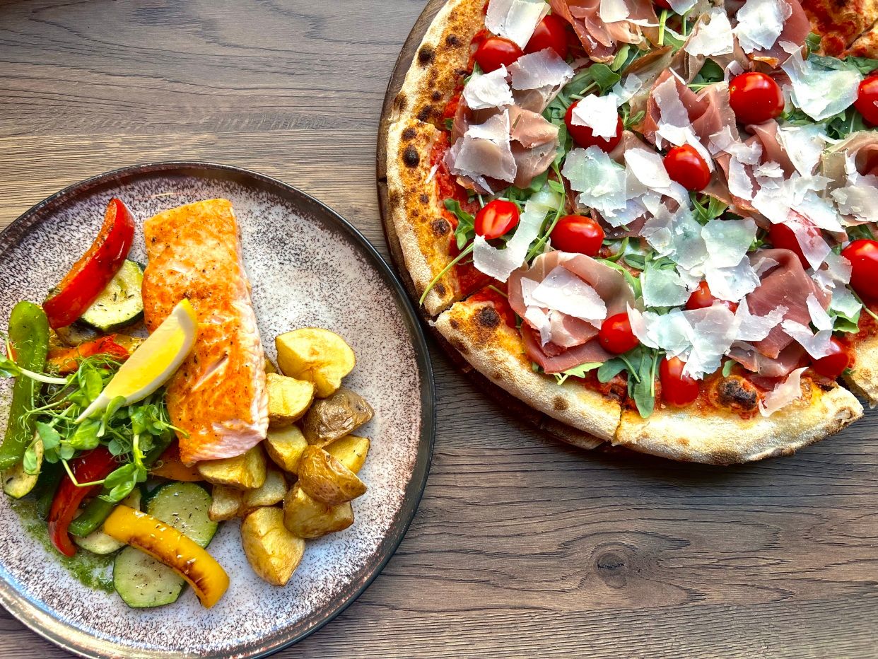 sos pomidorowy/mozzarella fior di latte/ salami picante/szynka/boczek/szynka parmeńska/cebula czerwona