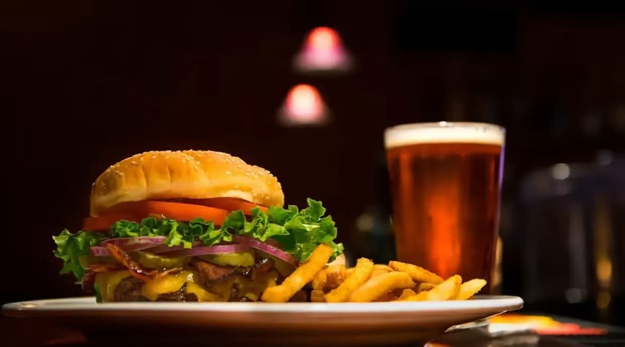 Поєднання бургера та картоплі з напоєм